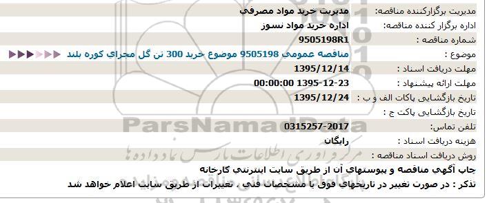 موضوع : مناقصه عمومی 9505198 موضوع خرید 300 تن گل مجرای کوره بلند