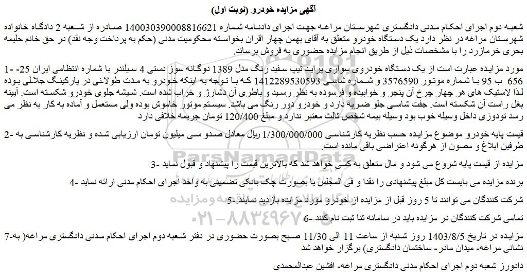 شعبه دوم اجرای احکام مدنی دادگستری شهرستان مراغه جهت اجرای دادنامه شماره 140030390008816621 صادره از شعبه 2 دادگاه خانواده شهرستان مراغه در نظر دارد یک دستگاه خودرو متعلق به آقای بهمن چهار اقران بخواسته محکومیت مدنی (حکم به پرداخت وجه نقد) در حق خانم حلیمه بحری خرمازرد را با مشخصات ذیل از طریق انجام مزایده حضوری به فروش برساند.