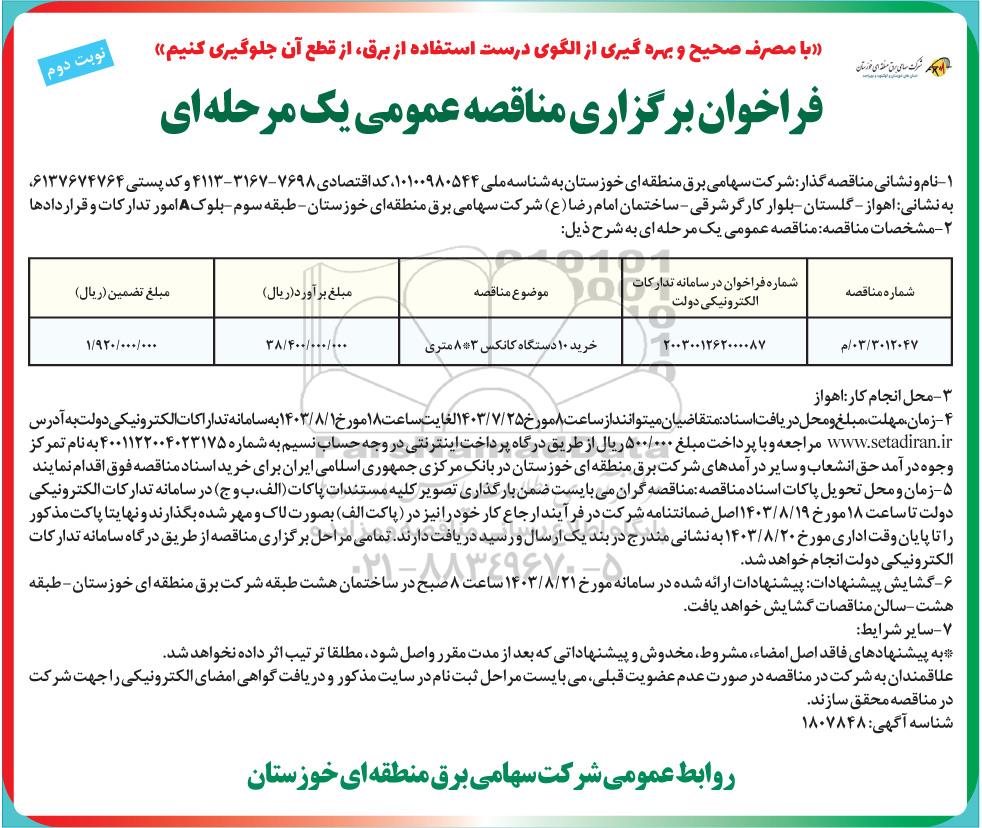1- نام و نشانی مناقصه گزار: شرکت سهامی برق منطقه ای خوزستان به شناسه ملی 10100980544 کد اقتصادی 7698-3167-4113 و کدپستی 6137674764