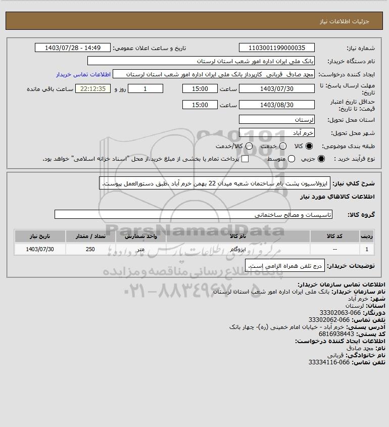 نام سازمان خریدار: بانک ملی ایران اداره امور شعب استان لرستان