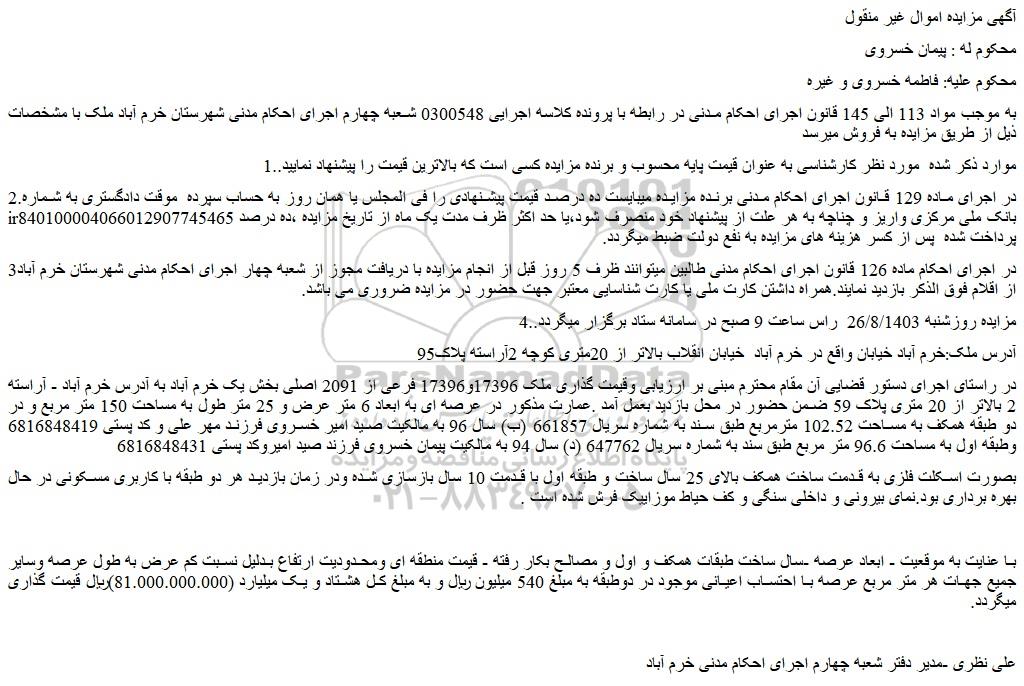 به موجب مواد 113 الی 145 قانون اجرای احکام مدنی در رابطه با پرونده کلاسه اجرایی 0300548 شعبه چهارم اجرای احکام مدنی شهرستان خرم آباد ملک با مشخصات ذیل از طریق مزایده به فروش میرسد