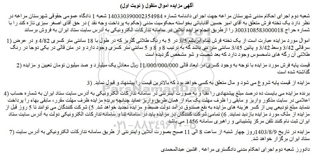 شعبه دوم اجرای احکام مدنی شهرستان مراغه جهت اجرای دادنامه شماره 140330390002354984 شعبه 1 دادگاه عمومی حقوقی شهرستان مراغه در نظر دارد یک تخته فرش متعلق به آقای امیر حسین آقابابائی بخواسته محکومیت مدنی (حکم به پرداخت وجه نقد ) در حق آقای اصغر سبزی تازه کند را با شماره حراج 3003108583000018 را ازطریق انجام مزایده آنلاین در سامانه تدارکات الکترونیکی به آدرس سایت ستاد ایران به فروش برساند