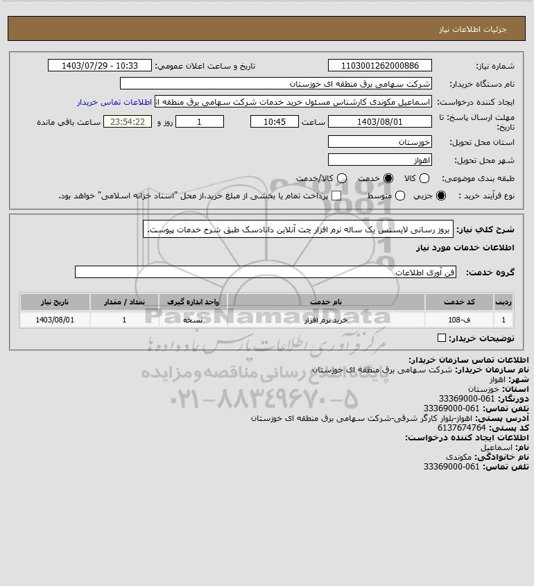 شرح کلی نیاز: بروز رسانی لایسنس یک ساله نرم افزار چت آنلاین دانادسک طبق شرح خدمات پیوست.