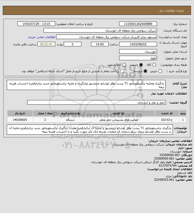 شرح کلی نیاز: بارگیری وتخلیه ترانسفورماتور T1 پست نوفل لوشاتو خرمشهر وبارگیری و تخلیه ترانسفورماتور جدید درانبارفجربا احتساب هزینه بیمه