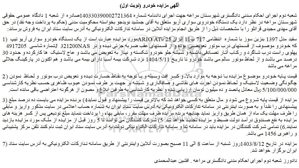 شعبه دوم اجرای احکام مدنی دادگستری شهرستان مراغه جهت اجرای دادنامه شماره 140330390002721364صادره از شعبه 1 دادگاه عمومی حقوقی شهرستان مراغه در نظر دارد یک دستگاه خودروی سواری آریو متعلق به آقای جمشید نویدجو بخواسته محکومیت مدنی (حکم به پرداخت وجه نقد) در حق آقای مهدی مجیدی قراتلو را با مشخصات ذیل را از طریق انجام مزایده آنلاین در سامانه تدارکات الکترونیکی به آدرس سایت ستاد ایران به فروش برساند: