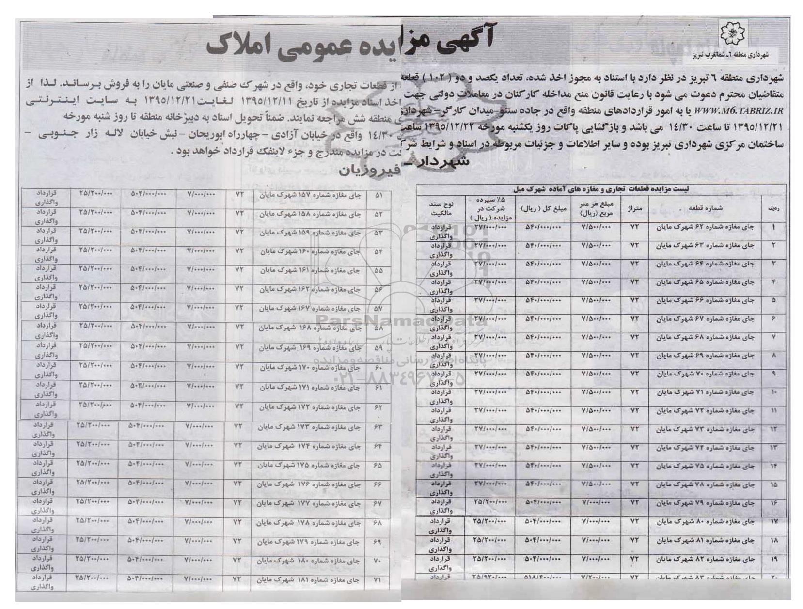 مزایده عمومی مزایده فروش 102 قطعه از قطعات تجاری برگزار میگردد. از کلیه افراد متخصص و شرکت‌های واجد شرایط دعوت به عمل می‌آید تا در این مزایده با کد خبرگزاری پارس نماد : 816146 شرکت نمایند تاریخ شروع مزایده : 1395/12/11 مهلت شرکت در مزایده: تا پایان روز 1395/12/21 مکان برگزاری اموال واگذاری استان‌های آذربایجان شرقی و دسته‌بندی‌های مربوط به این حراجی املاک و زمین میباشد.