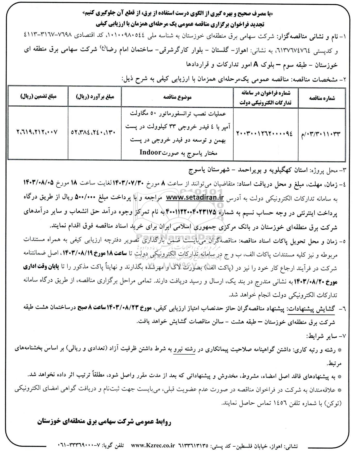 موضوع مناقصه: عملیات نصب ترانسفورماتور 50 مگاولت آمپر با 4 فیدر خروجی 33 کیلوولت در پست بهمن و توسعه دو فیدر خروجی در پست مختار یاسوج به صورت indoor