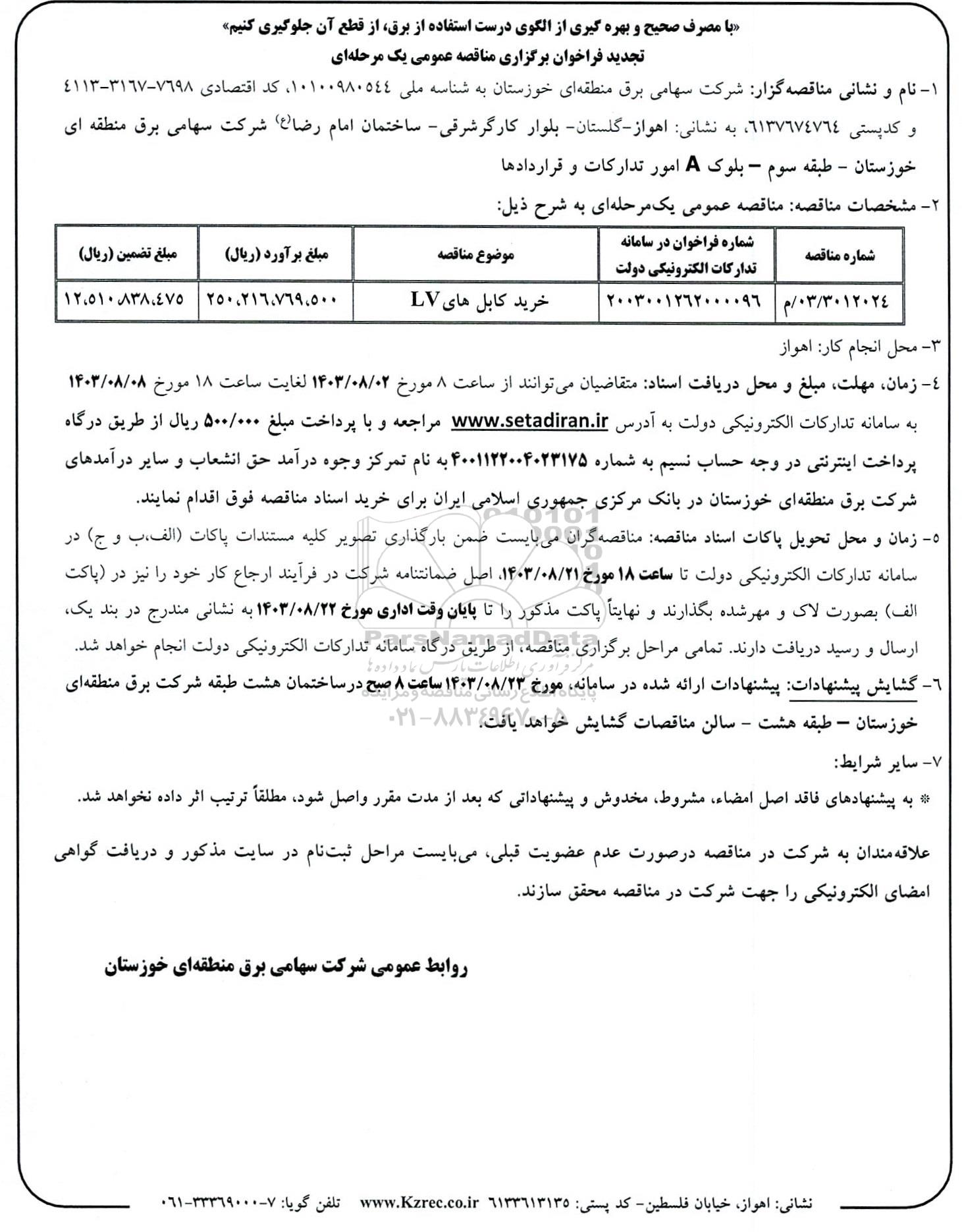03/3012024/م | 2003001262000096 | خرید کابل های LV | 250.216.769.500 | 12.510.838.475 |