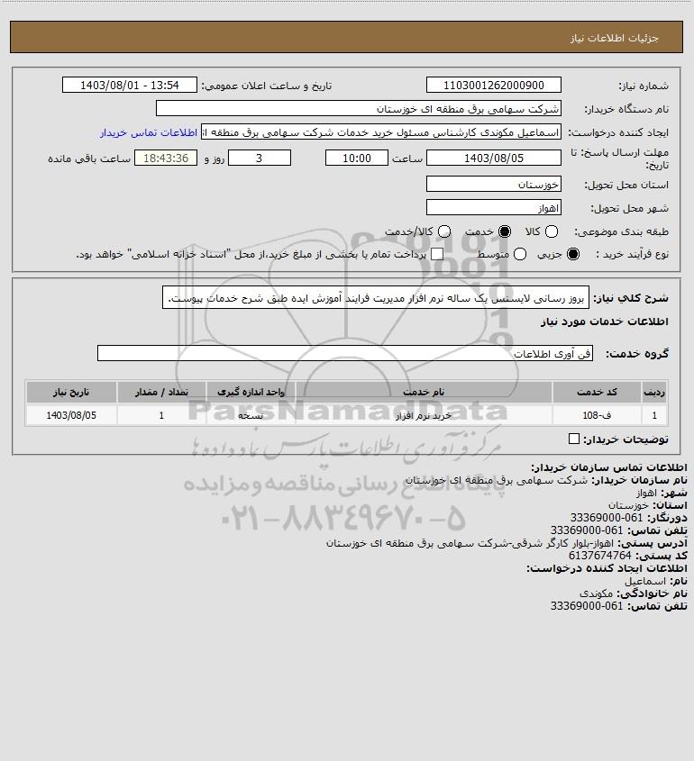 شرح کلی نیاز: بروز رسانی لایسنس یک ساله نرم افزار مدیریت فرایند آموزش ایده طبق شرح خدمات پیوست.