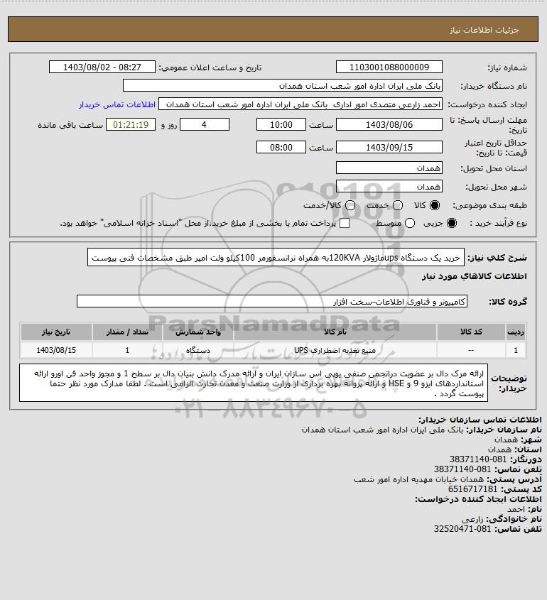 نام دستگاه خریدار:بانک ملی ایران اداره امور شعب استان همدان