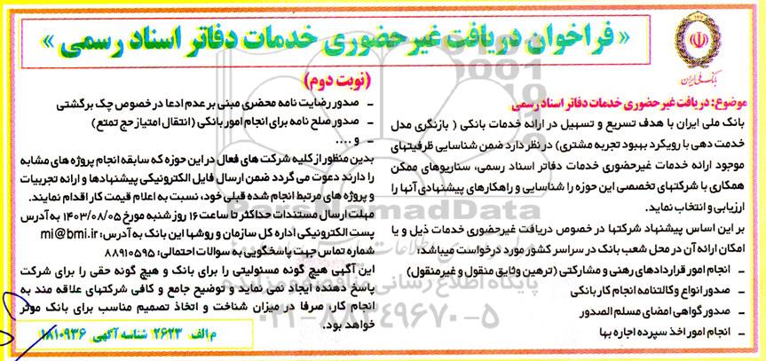 فراخوان دریافت غیرحضوری خدمات دفاتر اسناد رسمی - نوبت دوم از کلیه افراد متخصص و شرکتها واجد شرایط دعوت به عمل میآید در مناقصه با کد خبرگزاری پارس نماد: 8173659 شرکت نمایند.