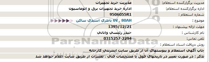 استعلام بها و موضوع استعلام استعلام 6V , 80AH باطری اسیدی ساکن 95.12.16 به اطلاع کلیه شرکتها و افراد متخصص واجد شرایط میرساند، آگهی گذار در نظر دارد از طریق استعلام بها، نسبت به انتخاب و دریافت پیشنهادات اقدام نماید. این استعلام با کد آگهی ثبت شده در سامانه خبرگزاری پارس نماد : 817546 منتشر شده است. مشخصات استعلام : تاریخ شروع استعلام: 1395/12/16 آخرین مهلت ارسال پیشنهاد قیمت : 1395/12/21 و محل اجرای پروژه : استان اصفهان میباشد. استعلام قیمت مورد درخواست : استعلام 6V , 80AH باطری اسیدی ساکن 95.12.16 با دستهبندیهای تخصصی و گروه های مرتبط : منابع تغذیه, تجهیزات برق و الکترونیک, استعلام اطلاع رسانی میگردد.