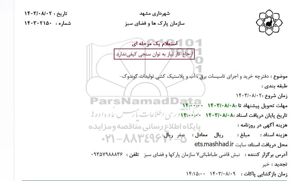 در صورت نیاز به دریافت راهنمایی یا پشتیبانی در خصوص استعلام و مناقصه و فراخوان مناقصه عمومی، مناقصه محدود، مناقصه بین‌ المللی، مناقصه دولتی، مناقصه خصوصی، مناقصه آنلاین فروش تجهیزات، مناقصه مشاوره‌ای مناقصه پتروشیمی و انرژی مناقصه صنایع و تجهیزات برق و مخابرات و نفت و گاز ... لطفاً با سایت خبری مناقصه و مزایده پارس‌نماد داده‌ها به شماره 88349670 تماس حاصل فرمایید.