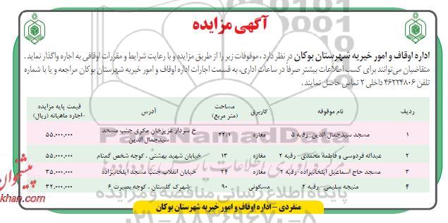 اداره اوقاف و امور خیریه شهرستان بوکان در نظر دارد موقوفات زیر را از طریق مزایده و با رعایت شرایط و مقررات اوقافی به اجاره واگذار نماید. متقاضیان می توانند برای کسب اطلاعات بیشتر صرفا در ساعات اداری به قسمت اجارات اداره اوقاف و امور خیریه شهرستان بوکان مراجعه و یا با شماره تلفن 46224806 داخلی 2 تماس حاصل نمایند.