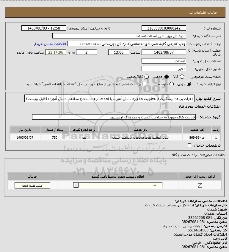 شرح کلی نیاز: اجرای برنامه پیشگیری از معلولیت ها ویژه دانش آموزی با اهداف ارتقای سطح سلامت دانش آموزان (فایل پیوست)