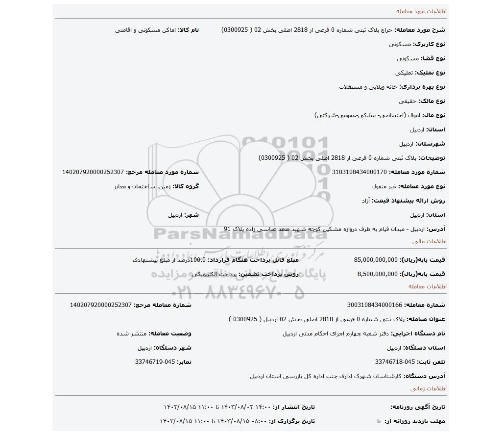 عنوان معامله: پلاک ثبتی شماره 0 فرعی از 2818 اصلی بخش 02 اردبیل ( 0300925 ) | ||