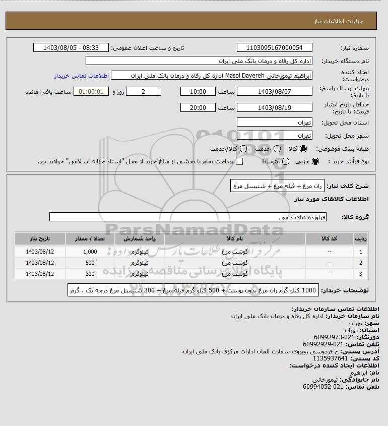 شرح کلی نیاز: ران مرغ + فیله مرغ + شنیسل مرغ