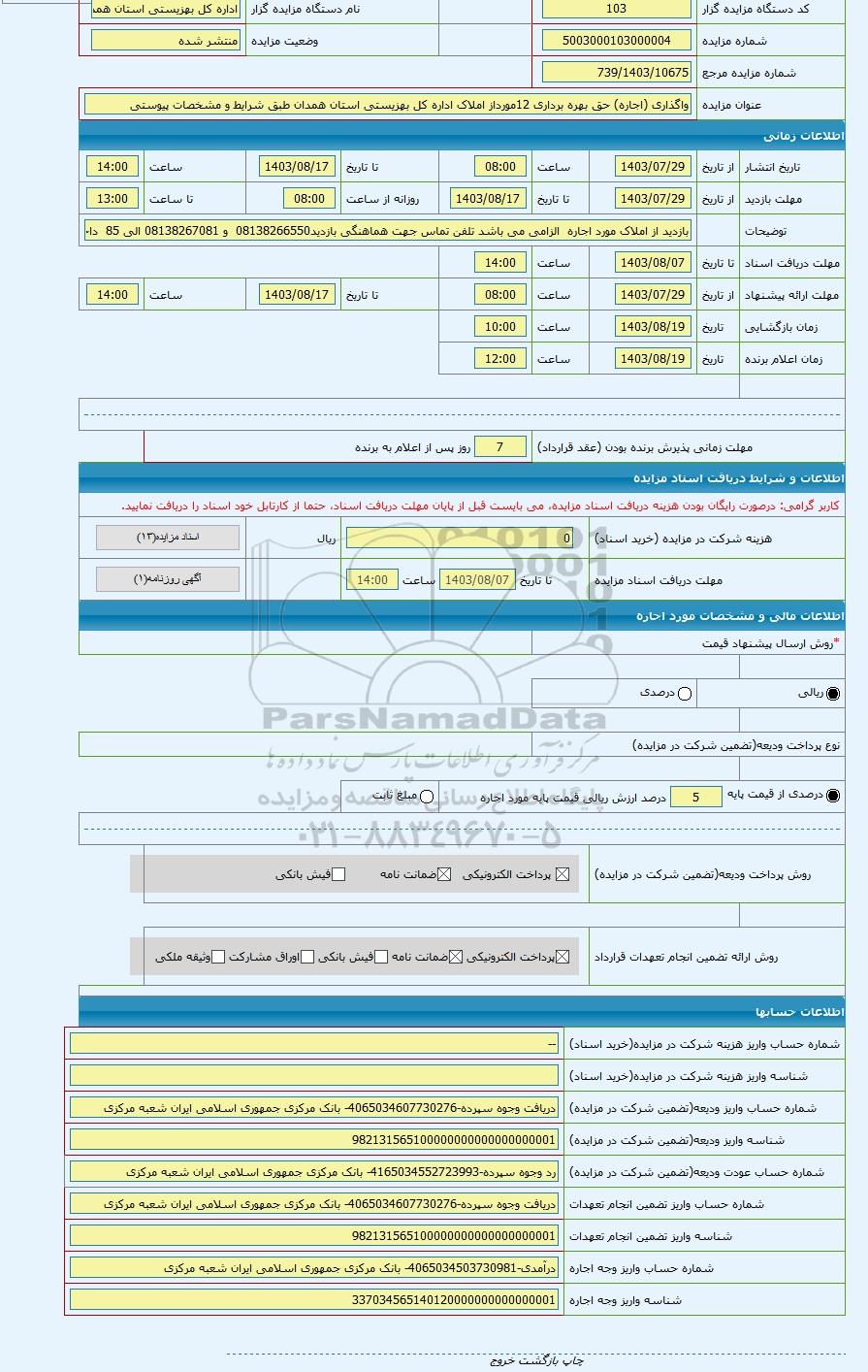 کد مزایده گزار103نام دستگاه مزایده گزاراداره کل بهزیستی استان همدان