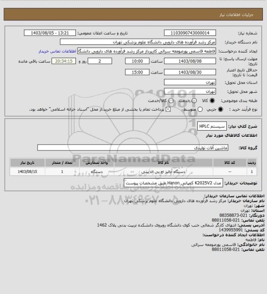 نام دستگاه خریدار:مرکز رشد فرآورده های دارویی دانشگاه علوم پزشکی تهران