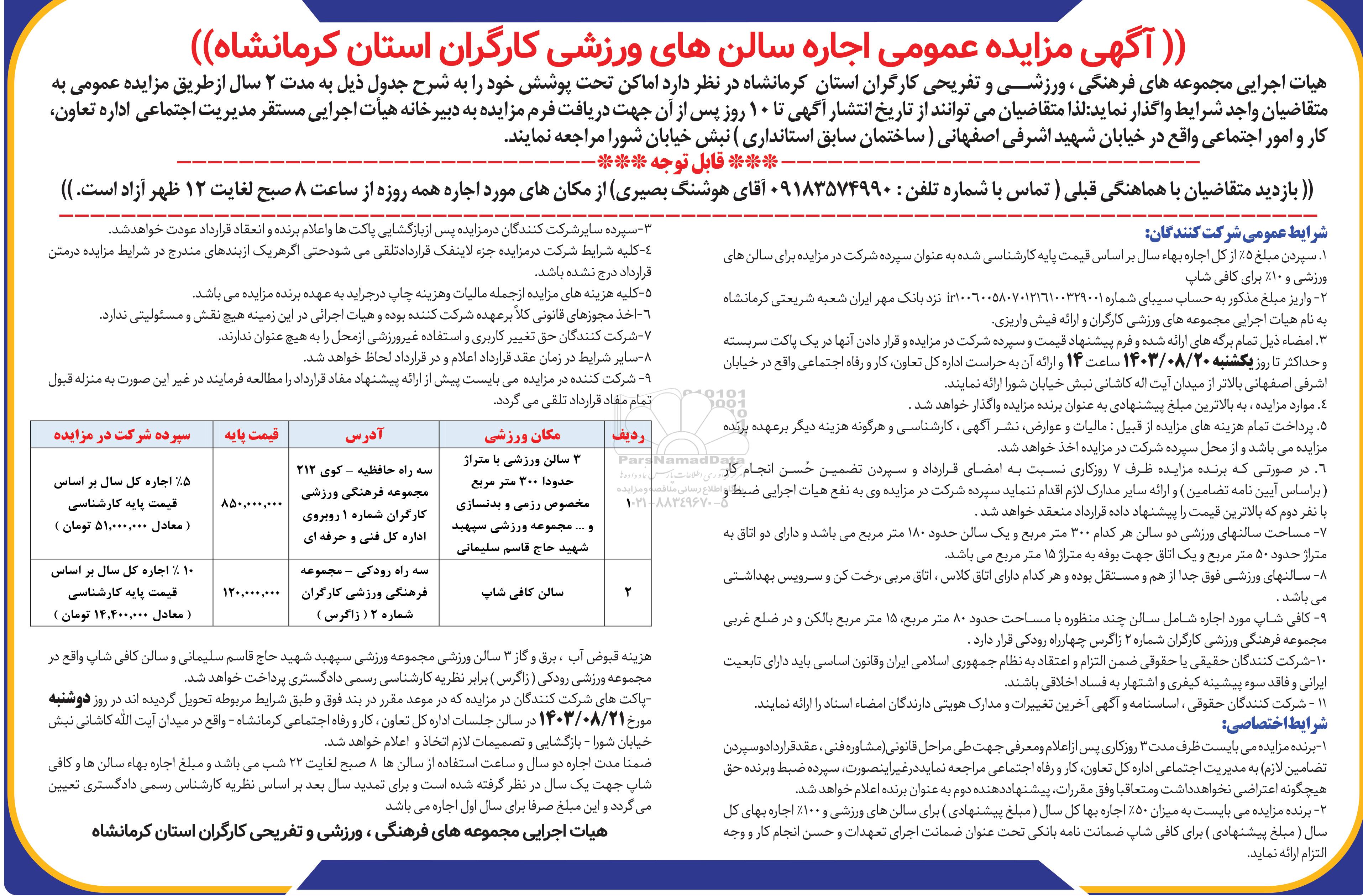 آگهی مزایده عمومی اجاره سالنهای ورزشی کارگران استان کرمانشاه؟