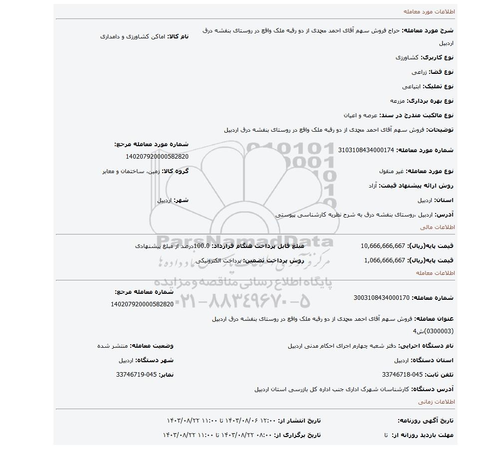 شرح مورد معامله: حراج فروش سهم آقای احمد محمدی از دو رقبه ملک واقع در روستای بنفشه درق اردبیل | نام کالا: اماکن کشاورزی و دامداری | |