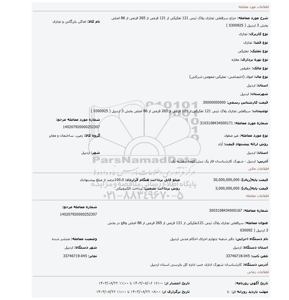 عنوان معامله: سرقفلی تجاری پلاک ثبتی 121تفکیکی از 121 فرعی از 265 فرعی از 86 اصلی واقع در بخش 3 اردبیل ( 030092 | ||