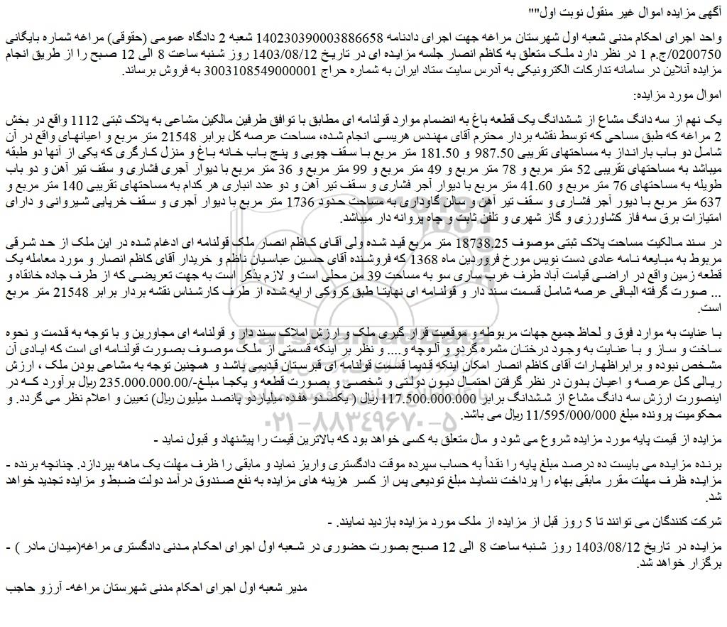 واحد اجرای احکام مدنی شعبه اول شهرستان مراغه جهت اجرای دادنامه 140230390003886658 شعبه 2 دادگاه عمومی (حقوقی) مراغه شماره بایگانی 0200750/ج.م 1 در نظر دارد ملک متعلق به کاظم انصار جلسه مزایده ای در تاریخ 1403/08/12 روز شنبه ساعت 8 الی 12 صبح را از طریق انجام مزایده آنلاین در سامانه تدارکات الکترونیکی به آدرس سایت ستاد ایران به شماره حراج 3003108549000001 به فروش برساند.