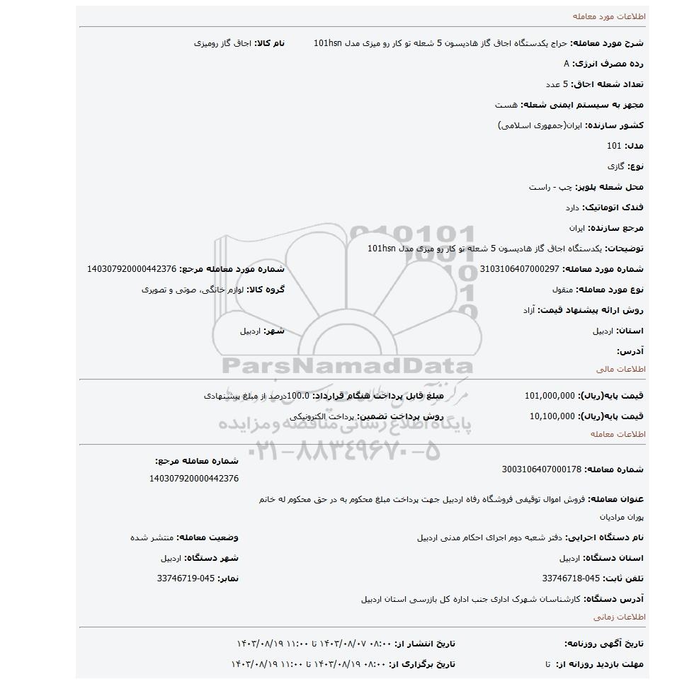 قیمت پایه(ریال): 10,100,000 | روش پرداخت تضمین: پرداخت الکترونیکی |