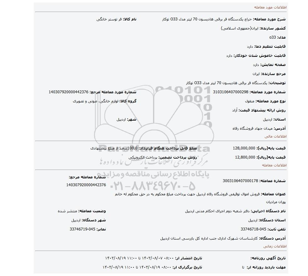 عنوان معامله: فروش اموال توقیفی فروشگاه رفاه اردبیل جهت پرداخت مبلغ محکوم به در حق محکوم له خانم پوران مرادیان