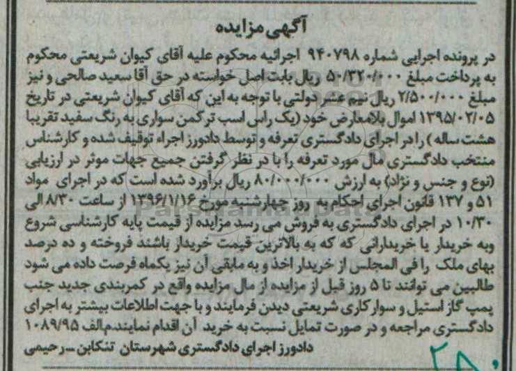 یک راس اسب ترکمن سواری به رنگ سفیئ به ارزش 80.000.000 ریال در روز چهارشنبه 96.1.16 از ساعت 8:30 الی 10:30 در اجرای دادگستری به فروش برسد