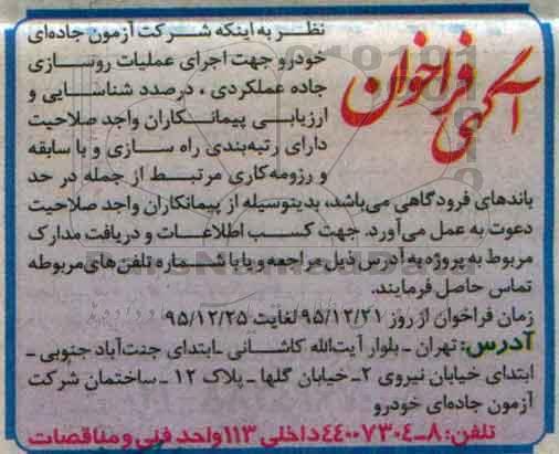 نظر به اینکه شرکت آزمون جاده ای خودرو جهت اجرای عملیات روسازی جاده عملکردی، درصدد شناسایی و ارزیابی پیمانکاران واجد صلاحیت دارای رتبه بندی راه سازی و با سابقه و رزومه کاری مرتبط از جمله در حد باندهای فرودگاهی می باشد بدین وسیله از پیمانکاران واجد صلاحیت دعوت به عمل می آورد جهت کسب اطلاعات و دریافت مدارک مربوط به پروژه به آدرس ذیل مراجعه و یا باشماره تلفن های مربوطه تماس حاصل فرمایند