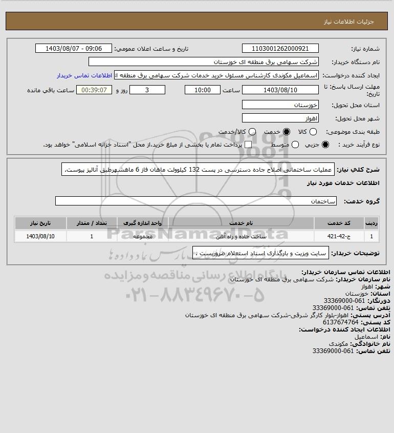 شرح کلی نیاز: عملیات ساختمانی اصلاح جاده دسترسی در پست 132 کیلوولت ماهان فاز 6 ماهشهرطبق آنالیز پیوست.