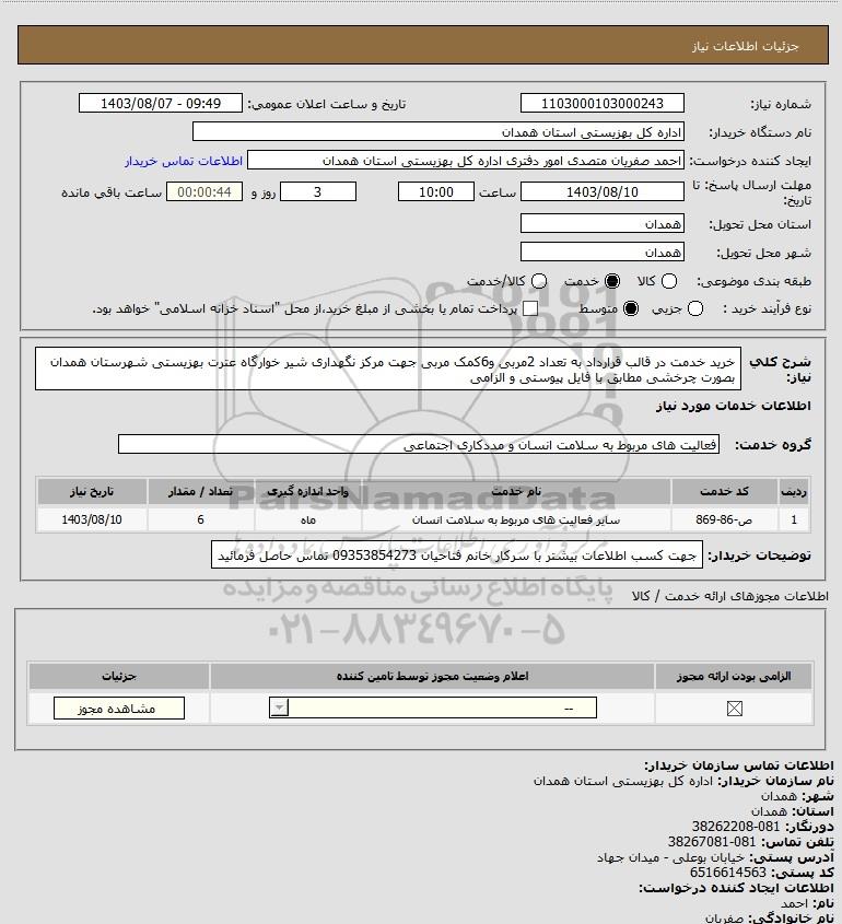 شرح کلی نیاز: خرید خدمت در قالب قرارداد به تعداد 2مربی و6کمک مربی جهت مرکز نگهداری شیر خوارگاه عترت بهزیستی شهرستان همدان بصورت چرخشی مطابق با فایل پیوستی و الزامی