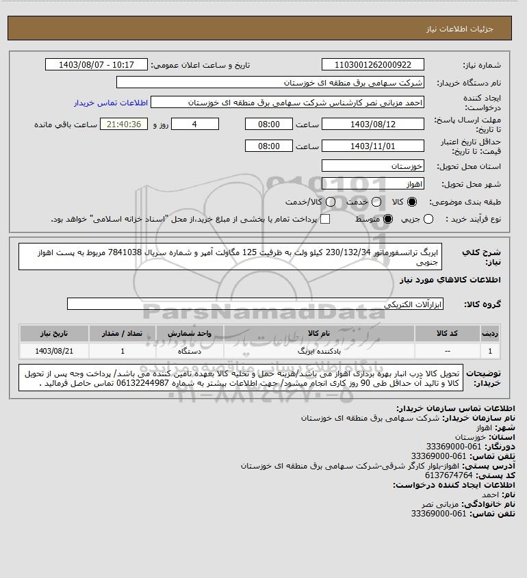 استعلام ایربگ ترانسفورماتور 230/132/34 کیلو ولت به ظرفیت 125 مگاولت آمپر و شماره سریال 7841038 مربوط به پست اهواز جنوبی, استعلام ایربگ ترانسفورماتور 230/132/34 کیلو ولت به ظرفیت 125 مگاولت آمپر و شماره سریال 7841038 مربوط به پست اهواز جنوبی