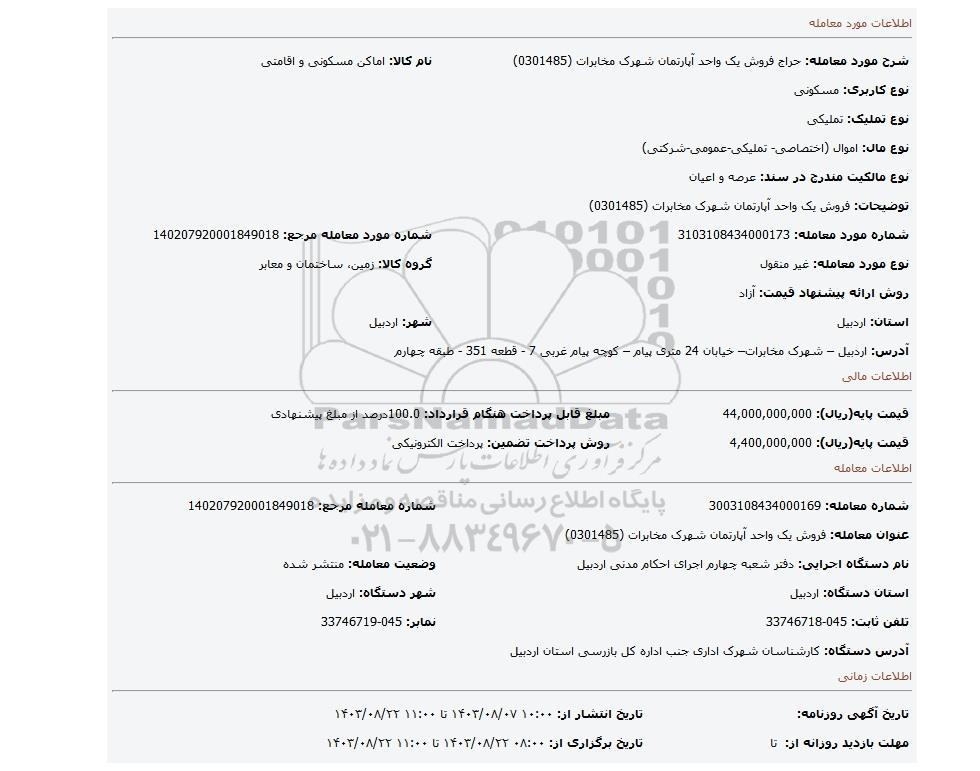 مزایده، فروش یک واحد آپارتمان شهرک مخابرات (0301485)