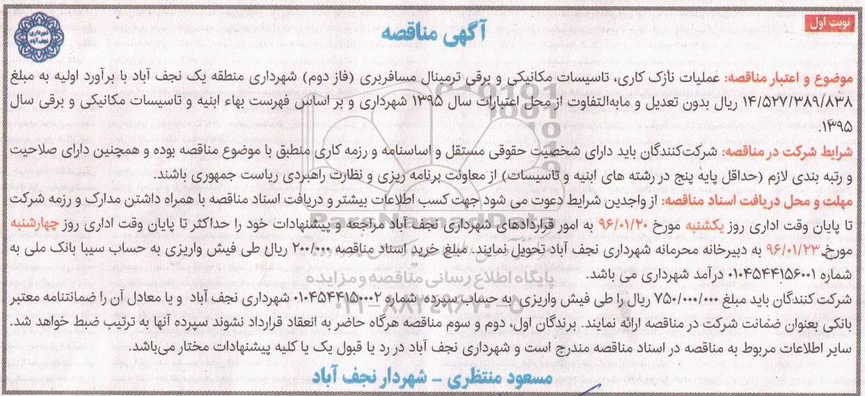 موضوع و اعتبار مناقصه: عملیات نازک کاری و تاسیسات مکانیکی و برقی ترمینال مسافربری فاز دوم شهرداری منطقه یک نجف آباد با برآورد اولیه به مبلغ 14.527.389.838 ریال بدون تعدیل و مابه التفاوت از محل اعتبارات سال 1395 شهرداری و بر اساس فهرست بهاء ابنیه و تاسیسات مکانیکی و برقی سال 1395
