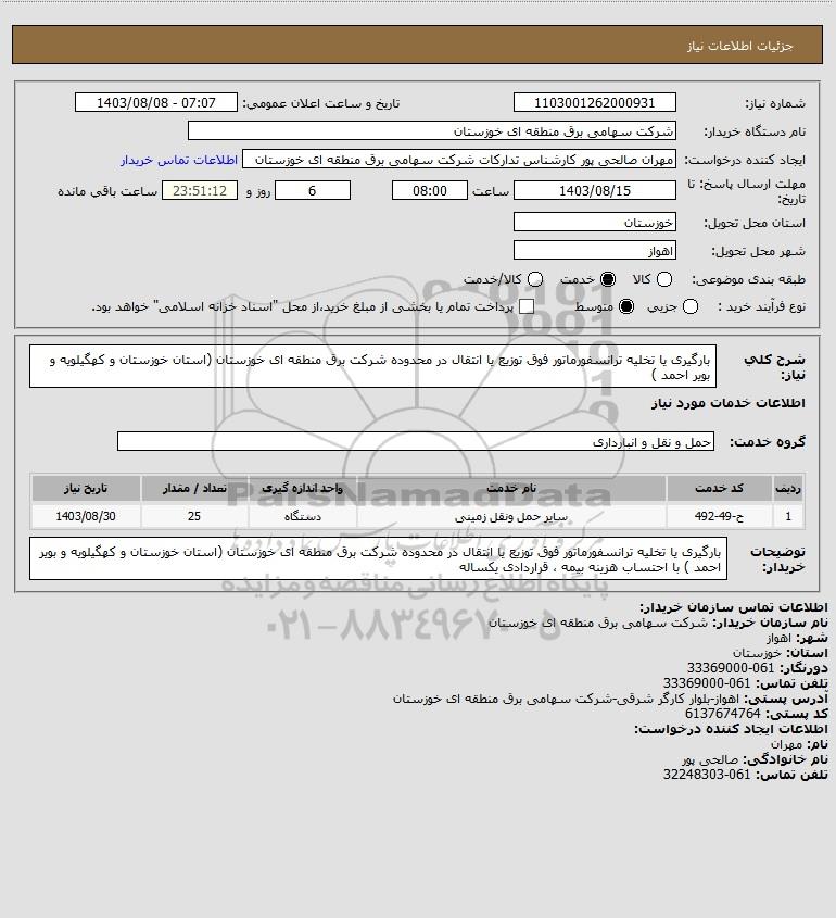 شرح کلی نیاز: بارگیری یا تخلیه ترانسفورماتور فوق توزیع یا انتقال در محدوده شرکت برق منطقه ای خوزستان (استان خوزستان و کهگیلویه و بویر احمد )
