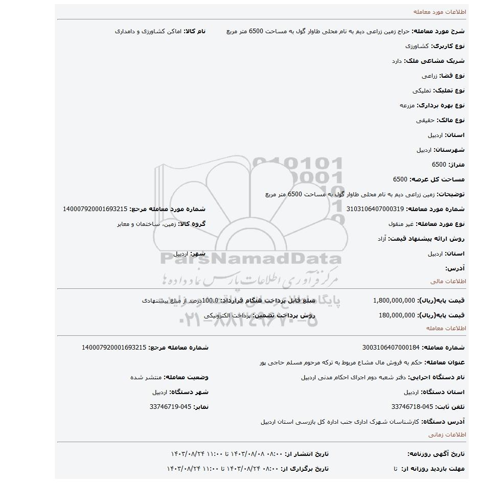 مزایده، زمین زراعی دیم به نام محلی طاوار گول به مساحت 6500 متر مربع