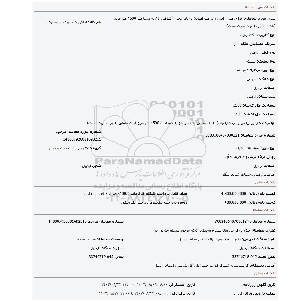 شرح مورد معامله: حراج زمین زراعی و درخت(اعیان) به نام محلی آشاغی باغ به مساحت 4500 متر مربع (ثلث متعلق به وراث مورث است) | نام کالا: اماکن کشاورزی و دامداری | |