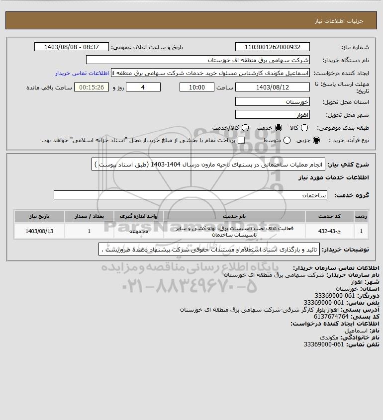 شرح کلی نیاز: انجام عملیات ساختمانی در پستهای ناحیه مارون درسال 1404-1403 (طبق اسناد پیوست )