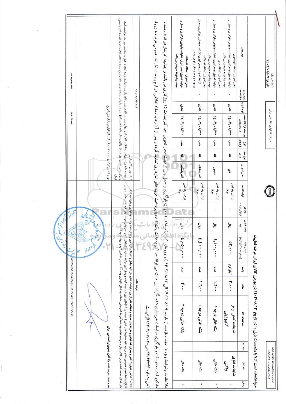 خواهشمند است کالا با مشخصات ذیل را در تاریخ 1403.8.13 در بورس کالای ایران عرضه نمایید: