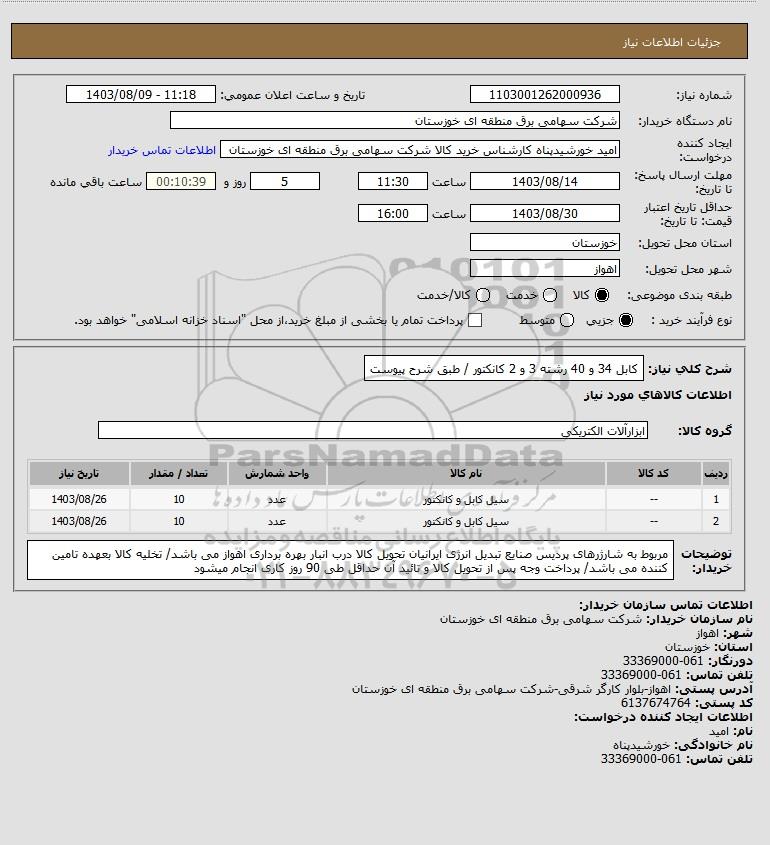 استعلام کابل 34 و 40 رشته 3 و 2 کانکتور / طبق شرح پیوست, استعلام کابل 34 و 40 رشته 3 و 2 کانکتور / طبق شرح پیوست