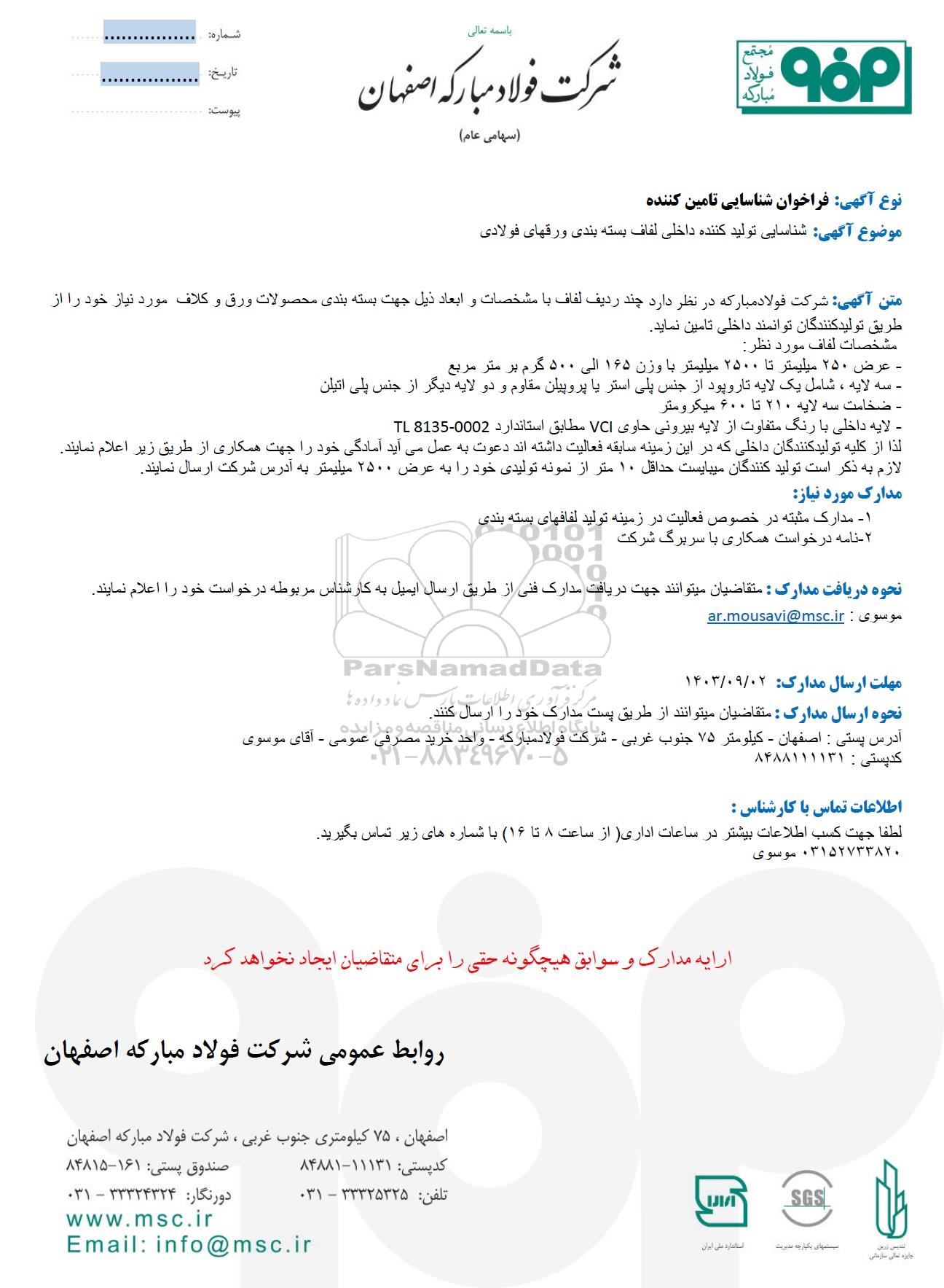 متن آگهی: شرکت فولاد مبارکه در نظر دارد چند ردیف لفاف با مشخصات و ابعاد ذیل جهت بسته بندی محصولات ورق و کلاف مورد نیاز خود را از طریق تولید کنندگان توانمند داخلی تامین نماید.