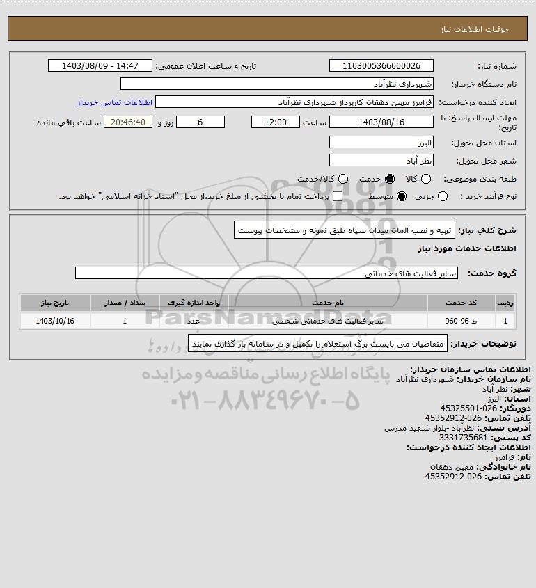 استعلام بها و موضوع استعلام استعلام تهیه و نصب المان میدان سپاه طبق نمونه و مشخصات پیوست به اطلاع کلیه شرکتها و افراد متخصص واجد شرایط میرساند، آگهی گذار در نظر دارد از طریق استعلام بها، نسبت به انتخاب و دریافت پیشنهادات اقدام نماید. این استعلام با کد آگهی ثبت شده در سامانه خبرگزاری پارس نماد : 8207788 منتشر شده است. مشخصات استعلام : تاریخ شروع استعلام: 1403/08/09 آخرین مهلت ارسال پیشنهاد قیمت : 1403/08/16 و محل اجرای پروژه : استان البرز میباشد. استعلام قیمت مورد درخواست : استعلام تهیه و نصب المان میدان سپاه طبق نمونه و مشخصات پیوست با دستهبندیهای تخصصی و گروه های مرتبط : تجهیزات پارک و مبلمان شهری, طراحی چاپ و تبلیغات, ساختمان, استعلام اطلاع رسانی میگردد.