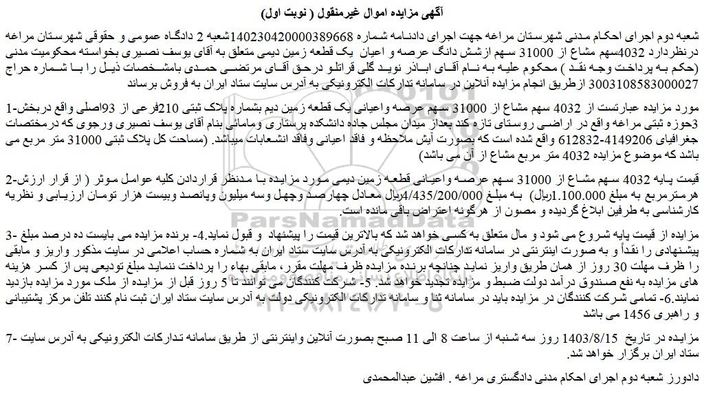 شعبه دوم اجرای احکام مدنی شهرستان مراغه جهت اجرای دادنامه شماره 140230420000389668شعبه 2 دادگاه عمومی و حقوقی شهرستان مراغه درنظردارد 4032سهم مشاع از 31000 سهم ازشش دانگ عرصه و اعیان یک قطعه زمین دیمی متعلق به آقای یوسف نصیری بخواسته محکومیت مدنی (حکم به پرداخت وجه نقد ) محکوم علیه به نام آقای اباذر نوید گلی قراتلو درحق آقای مرتضی حمدی بامشخصات ذیل را با شماره حراج 3003108583000027 ازطریق انجام مزایده آنلاین در سامانه تدارکات الکترونیکی به آدرس سایت ستاد ایران به فروش برساند