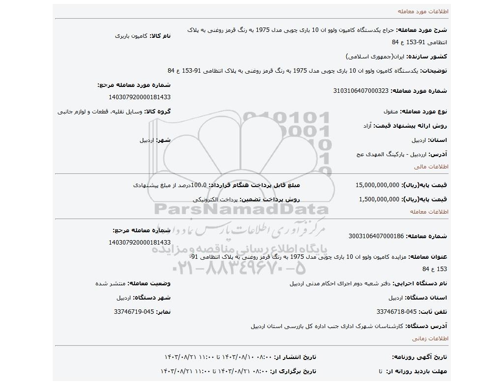 مزایده یکدستگاه کامیون ولوو ان 10 باری چوبی مدل 1975 به رنگ قرمز روغنی به پلاک انتظامی 91-153 ع 84 ؟