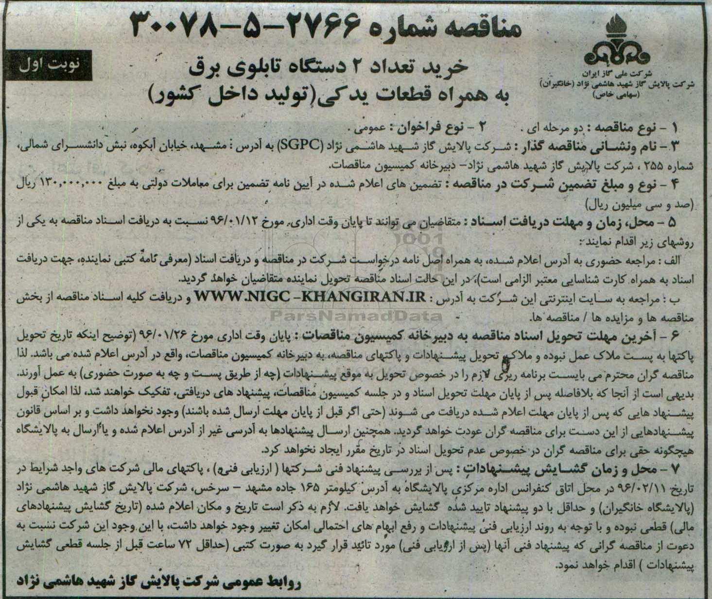 7- محل و زمان گشایش پیشنهادات: پس از بررسی پیشنهاد فنی شرکتها (ارزیابی فنی) ، پاکتهای مالی شرکتهای واجد شرایط در تاریخ 96.2.11 در محل اتاق کنفرانس اداره مرکزی پالایشگاه به آدرس کیلومتر 165 جاده مشهد سرخس شرکت پالایش گاز شهید هاشمی نژاد پالایشگاه خانگیران و حداقل با دو پیشنهاد تایید شده گشایش خواهد یافت. لازم به ذکر است تاریخ و مکان اعلام شده (تاریخ گشایش پیشنهادهای مالی) قطعی نبوده و با توجه به روند ارزیابی فنی پیشنهادات و رفع ابهام های احتمالی امکان تغییر وجود خواهد داشت. با این وجود این شرکت نسبت به دعوت از مناقصه گرانی که پیشنهاد فنی آنها (پس از ارزیابی فنی) مورد تایید قرار گیرد به صورت کتبی (حداقل 72 ساعت قبل از جلسه قطعی گشایش پیشنهادات) اقدام خواهد نمود.