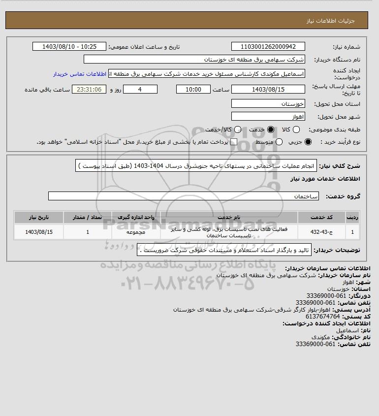 شرح کلی نیاز: انجام عملیات ساختمانی در پستهای ناحیه جنوبشرق درسال 1404-1403 (طبق اسناد پیوست )
