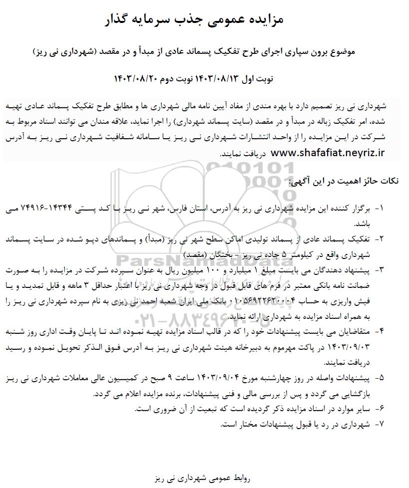 1- برگزار کننده این مزایده شهرداری نی ریز به آدرس استان فارس شهر نی ریز با کد پستی 14344-74916 میباشد.