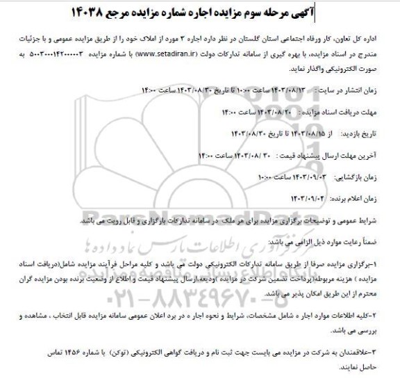 اداره کل تعاون کار و رفاه اجتماعی استان گلستان در نظر دارد اجاره 3 مورد از املاک خود را از طریق مزایده عمومی و با جزئیات مندرج در استاد مزایده با بهره گیری از سامانه تدارکات دولت سایت ستاد ایران با شماره مزایده 5003000142000003 به صورت الکترونیکی واگذار نماید.